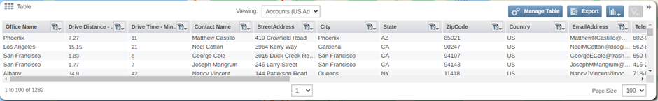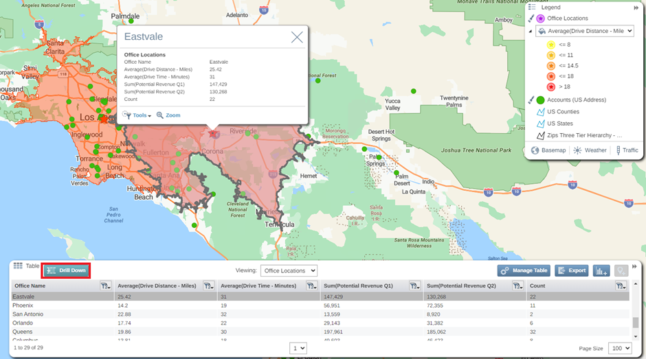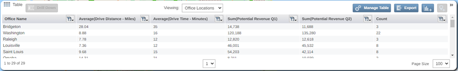 If you chose to include outside results from the Drive Time Analysis settings, you will also see a category called Outside that sums all the pin values that fall outside your drive time buffers. You can also include additional numerical columns to this table by selecting selecting Manage Table in the top right of your table. To see a more detailed view of the pins that fall within a drive time buffer, click on the center point record in the table and select the drill down option.